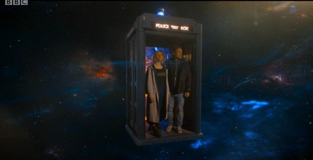 There are some stunning moments of cinematography throughout this story and some great images. The shots of galactic destruction by the Flux are great, and I particularly loved the shots of the TARDIS firing vortex energy into it towards the end of the story. I think that one of the most effective moments of the story is where the Weeping Angel approaches Claire as she attempts to get her keys in the lock whilst keeping her eyes on it. The audience knows what the most likely outcome will be, but it’s still incredibly effective television. My favourite of these shots might be those of the TARDIS crew looking out at space in one of this story’s few quiet moments. It is beautiful. I think the malfunctioning TARDIS ironically worked quite well, and I enjoyed the doors springing up everywhere, which is presumably linked to the Flux, but it’s also quite nice to see that it is still temperamental. It has felt like it has perhaps been too reliable in the Thirteenth Doctor’s era, and I particularly welcomed the return of the mallet, which sounds like an odd thing to say, but part of the TARDIS’s charm is that element of unreliability.