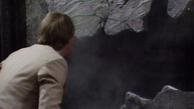 The Awakening is certainly a visual feast and benefits from some great location and set-based work. The church in the village is possibly one of the best I’ve seen in Doctor Who, and if I hadn’t known previously, I wouldn’t have necessarily leapt to the assumption that it was a set. In particular, the stained glass window in the background looks really authentic and adds a splash of colour to a mostly grey church. The location shooting is great, especially watching people in English Civil War era armour on horseback, with hints of modernity such as telephone boxes. The Malus is another example of good design and is, I think, a rightly iconic image from the Davison era. It is really sinister, especially when combined with the moving green eyes and dry ice spewing from the wall, and I think it works really well as it bursts through the wall in the church. It really conveys a sense of menace and threat, which its static psychic projections ultimately don’t do.