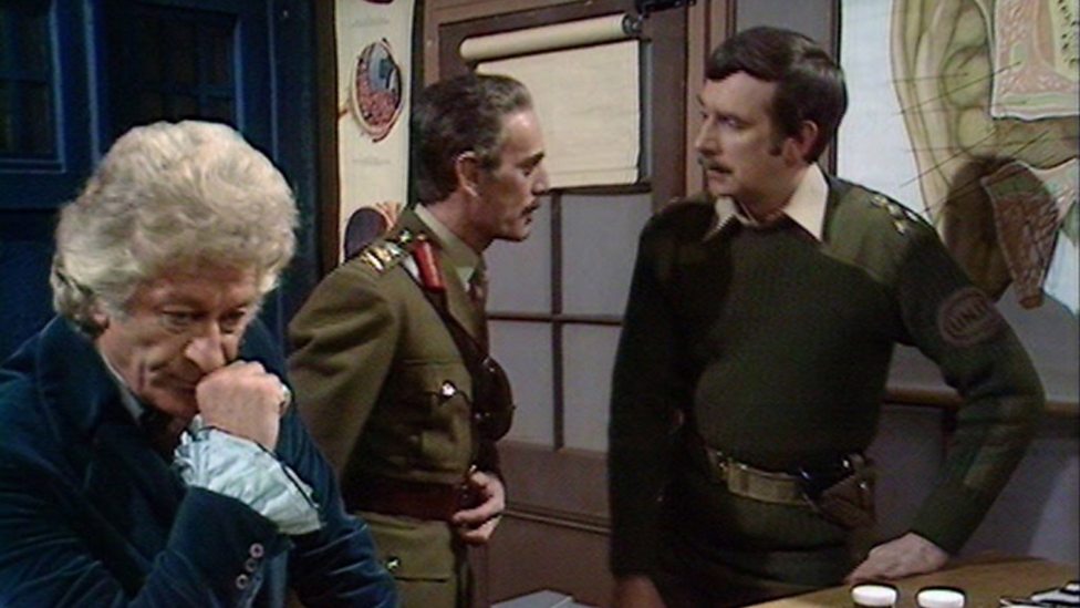 The Third Doctor is approaching the end of the lifespan of this particular incarnation, but I don’t think that Pertwee’s performance shows any of that. From his playing up when he and Sarah are being photographed as looters, to his reaction to General Finch when they first meet, Pertwee remains the same figure that he has always been. Pertwee seems to enjoy being in this setting, with an interesting story and plenty of action to get his teeth into, especially in the scenes where he is on the run from UNIT, the closest thing this Doctor has had to a family since his exile to the planet in The War Games. The loyalty that Benton shows him, for instance, in letting him knock him out so he can escape after Finch has framed him, is really lovely to see, and the Brigadier is of course, still loyal to his friend. There is a brief moment when that loyalty is in question, but the audience should know that it is never in doubt.