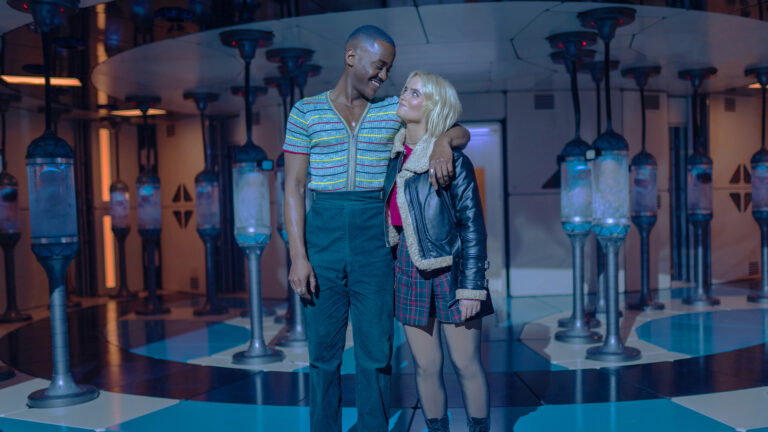 Space Babies does have a lot of heavy lifting to do in establishing the show for a new audience. Of course, Russell T Davies has history of doing this, having rebooted the show in 2005 with Rose, and Series One generally, and Space Babies owes a lot to those stories. There are a few nods to The End of the World, especially when the Doctor and Ruby stand in front of that view window and in Ruby’s call to Carla, which echoes Rose’s call to Jackie. On the other hand, Space Babies also revels in the fact that Doctor Who has been an ongoing series since 2005, so it almost feels as though the new audience just needs to accept things and get onboard. We get mentions of the Rani, the fact that the Doctor is a foundling and the existence of Gallifrey and the genocide of its people. It’s the show almost setting out its groundwork and it feels although the cards are well and truly on the table for the new viewers. The story is wise to keep the Doctor and Ruby moving throughout this, as whilst this is all information that is old hat to longstanding fans, it’s quite heavy and mixed up with moments of humour, like the stepping on the butterfly sequence in pre-historic times or the Nan-E filter. There is also a good message about refugees, which is what the Space Babies are, and the fact that they have to get to a place of safety, rather than that place of safety reaching out to them and the station being abandoned due to a recessions, but the baby creating process was not shut down.